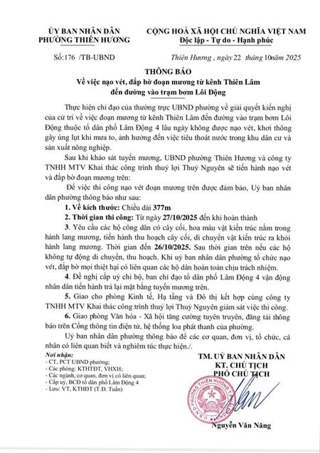 Ủy ban nhân dân phường Thiên Hương thông báo về việc nạo vét, đắp bờ đoạn mương từ kênh Thiên Lâm đến đường vào trạm bơm Lôi Động.