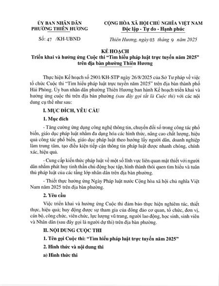 Phường Thiên Hương phát động tới toàn thể nhân dân tham gia cuộc thi "Tìm hiểu pháp luật trực tuyến năm 2025" trên địa bàn thành phố Hải Phòng.