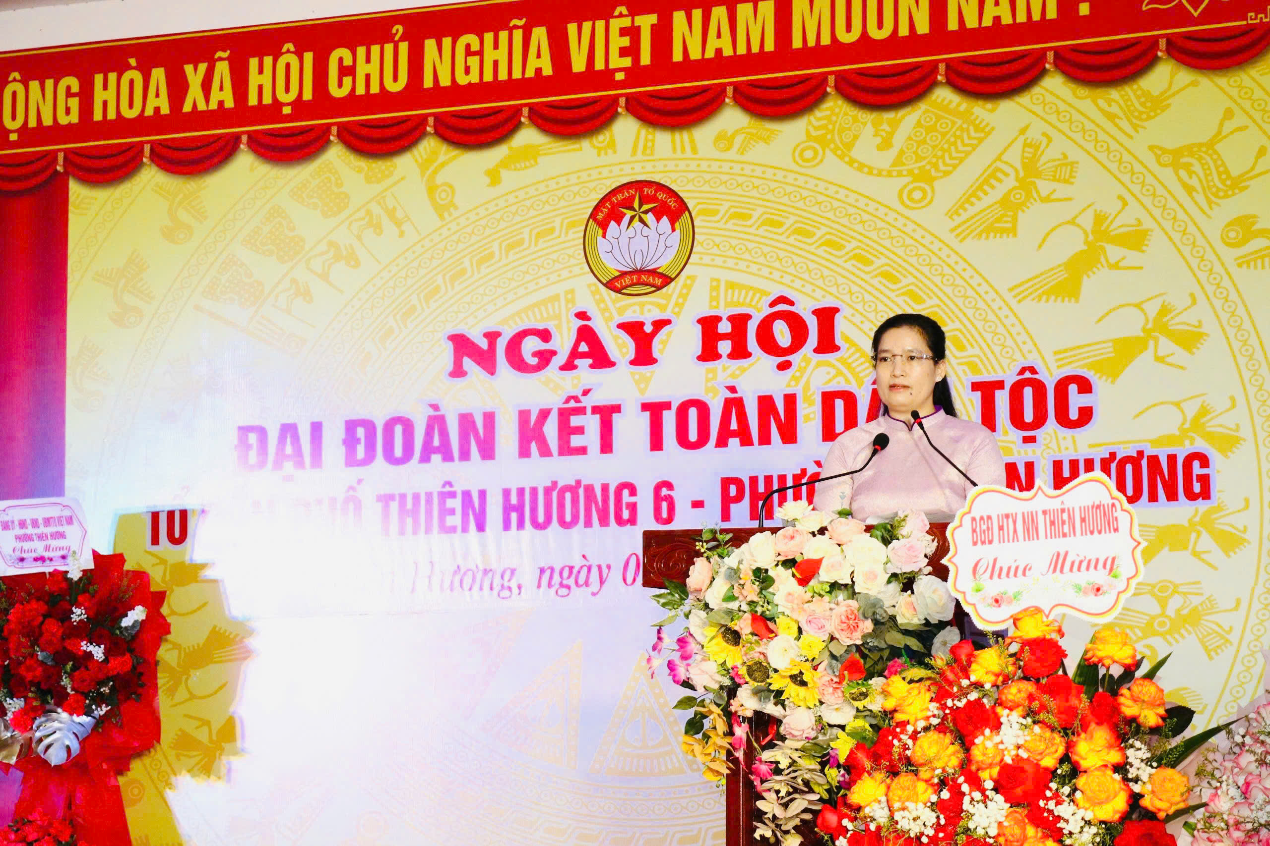 Phát biểu tại Ngày hội, đồng chí Vương Toàn Thu Thủy – Bí thư Đảng ủy, Chủ tịch HĐND phường biểu dương tinh thần đoàn kết, gắn bó của Nhân dân tổ dân phố Thiên Hương 6, đồng thời mong muốn tập thể cán bộ, đảng viên và Nhân dân trong tổ dân phố tiếp tục phát huy sức mạnh khối đại đoàn kết toàn dân tộc, góp phần xây dựng phường Thiên Hương ngày càng giàu đẹp, văn minh, nghĩa tình.