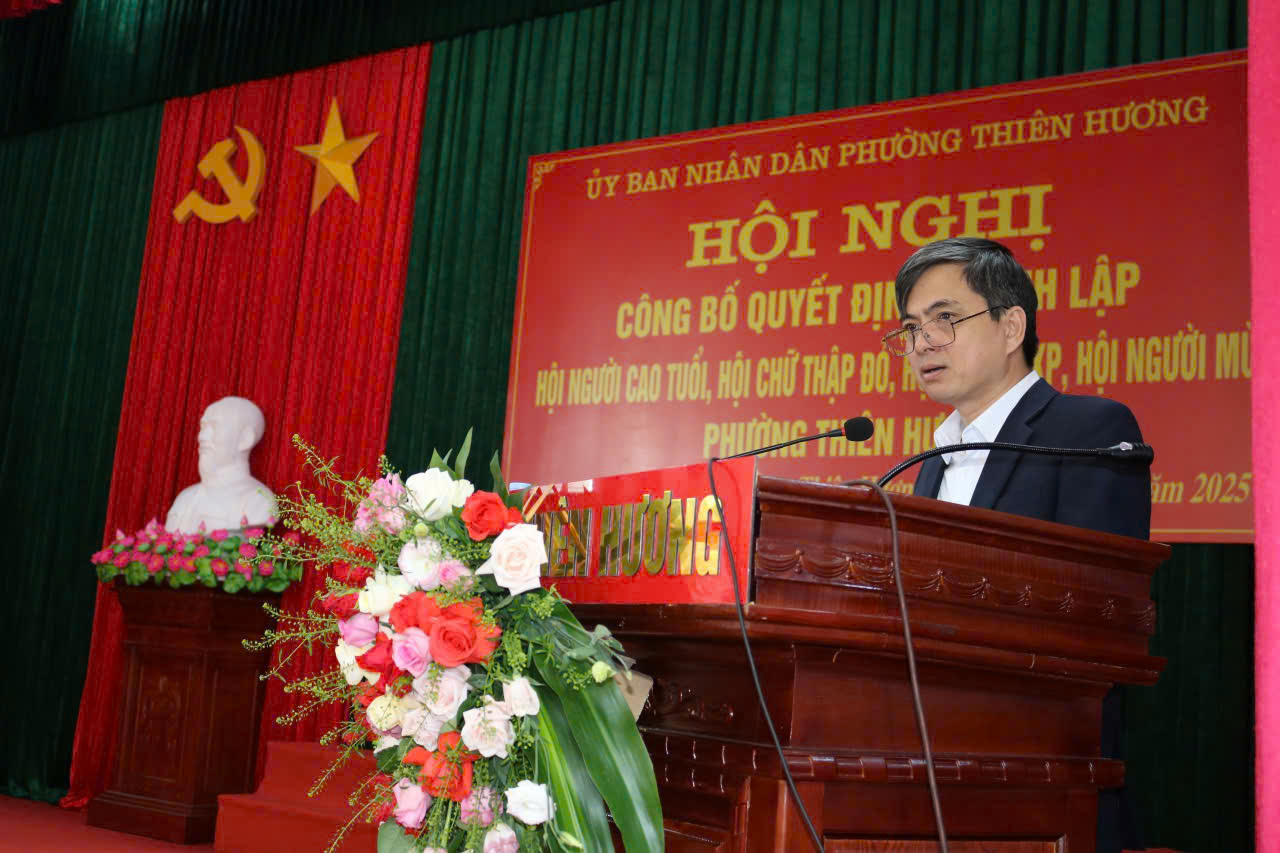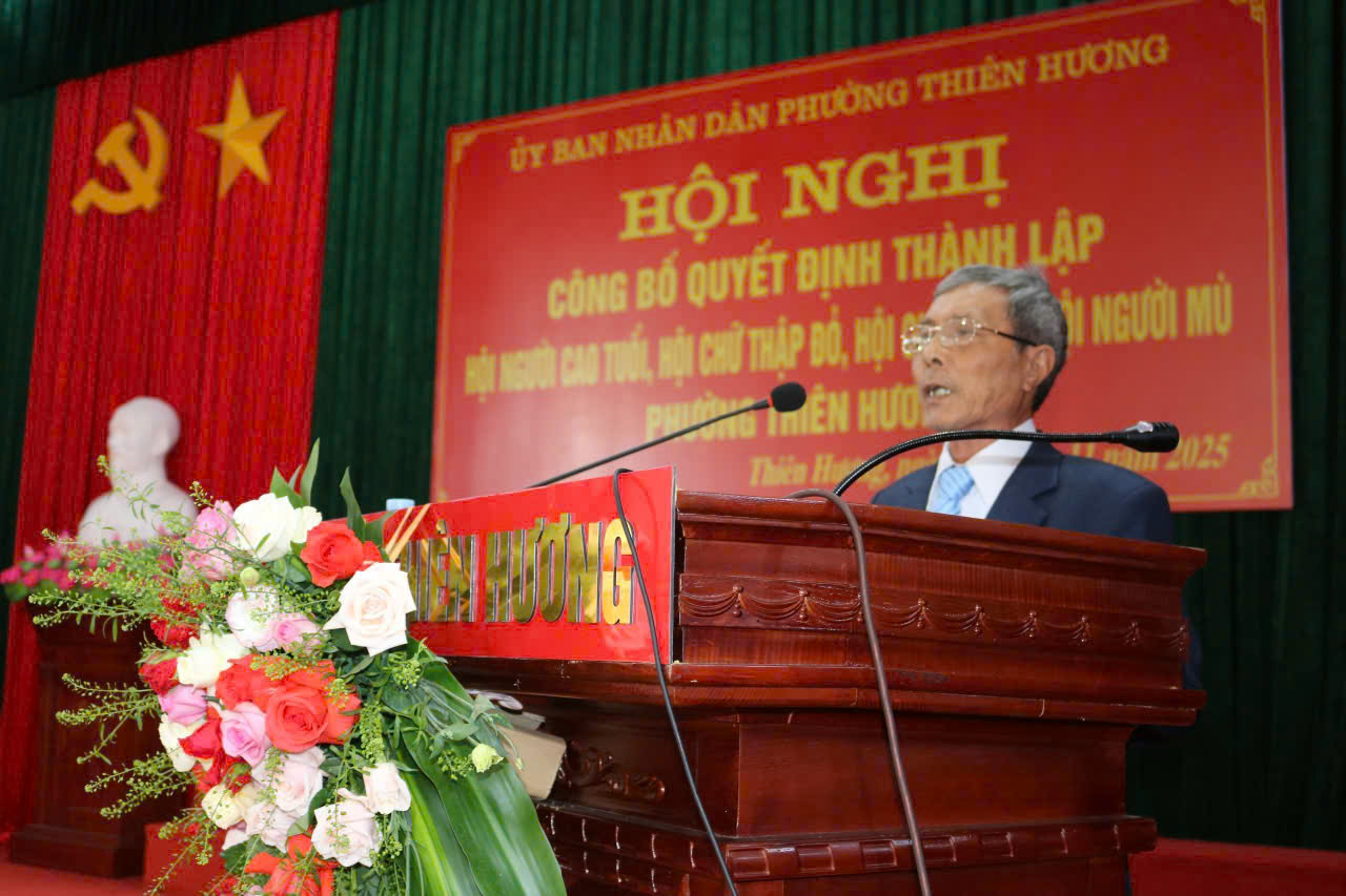 Phát biểu tại hội nghị, đồng chí Nguyễn Văn Năng – Phó Chủ tịch UBND phường khẳng định: Việc thành lập các tổ chức Hội là chủ trương đúng đắn của Đảng ủy, HĐND, UBND, UBMTTQVN phường, giúp tập trung nguồn lực xã hội, nâng cao chất lượng hoạt động và phát huy vai trò của các tầng lớp Nhân dân trong phát triển kinh tế – xã hội. Đồng chí tin tưởng rằng, với tinh thần đoàn kết và trách nhiệm, các Hội sẽ tiếp tục khai thác thế mạnh của mình, đặc biệt là Hội Người cao tuổi với truyền thống “Tuổi cao – gương sáng”, góp phần xây dựng phường Thiên Hương ngày càng văn minh, giàu đẹp.